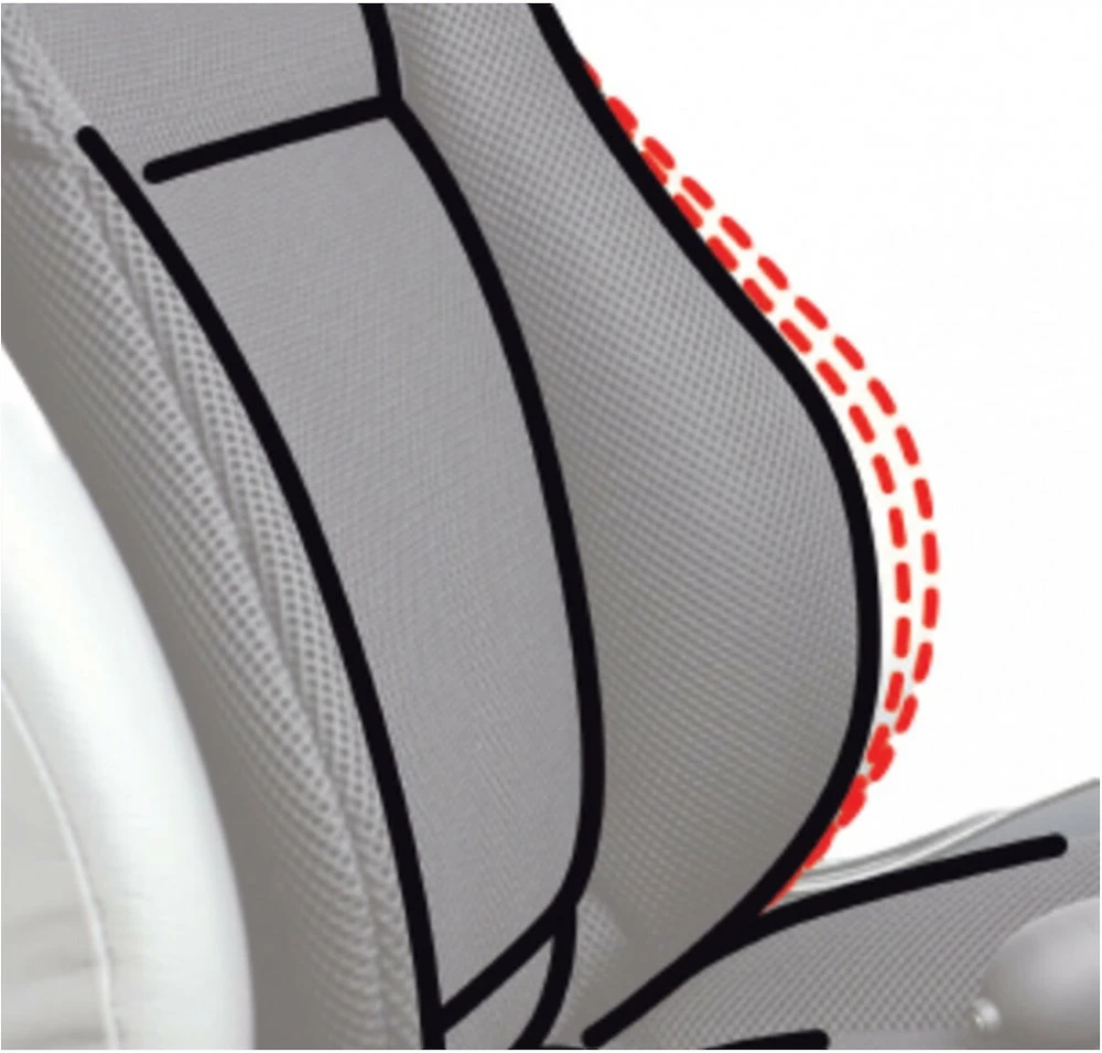 Ultimativ individuell einstellbare „High-End“- Rücken- und Seitenstütze mit Stoff „3D black“, der edel aussieht und die Luftzirkulation fördert.