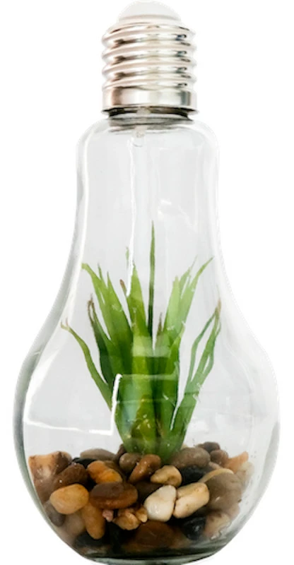 Dekorative Lampe in Form einer Glühbirne mit Kunstpflanze und Deko-Steinen