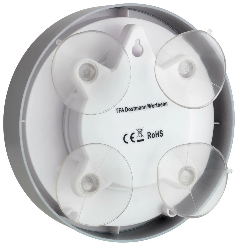 Vier große Saugnäpfe auf der Rückseite sorgen für einen sicheren Halt auf Fliesen oder Spiegelflächen – ganz ohne Bohren. Alternativ kann die feuchtigkeitsgeschützte Uhr auch aufgestellt oder mit der Aufhängeöse befestigt werden.