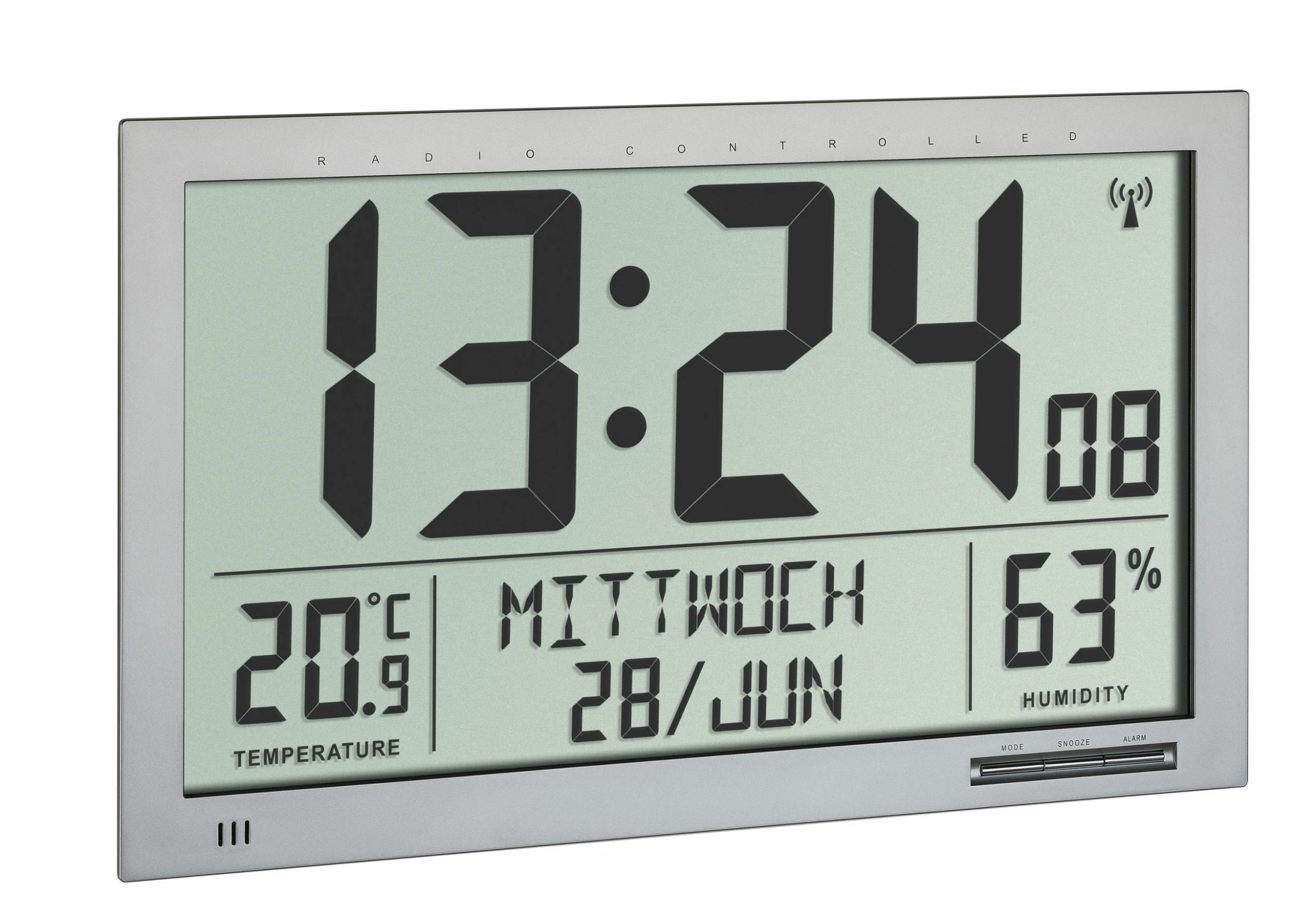 Diese Funkuhr überzeugt durch das ausgesprochen übersichtliche Display. Die großformatige Anzeige lässt sich auch von weitem gut ablesen und eignet sich besonders für den Eingangs- oder Empfangsbereich, das Wartezimmer und das Büro. Neben dem Datum mit dem voll ausgeschriebenen Wochentag wird auch die Innentemperatur und Luftfeuchtigkeit angezeigt. So können Sie für ein angenehmes Klima in Ihren Wohn- und Arbeitsräumen sorgen. Die Uhrzeit wird über das DCF77 Signal auf die Sekunde genau eingestellt und auch der Wechsel von Winter- auf Sommerzeit erfolgt automatisch. Das schlichte und klare Design passt in jede Umgebung, gleichgültig, ob Sie die Funkuhr aufhängen oder hinstellen möchten.