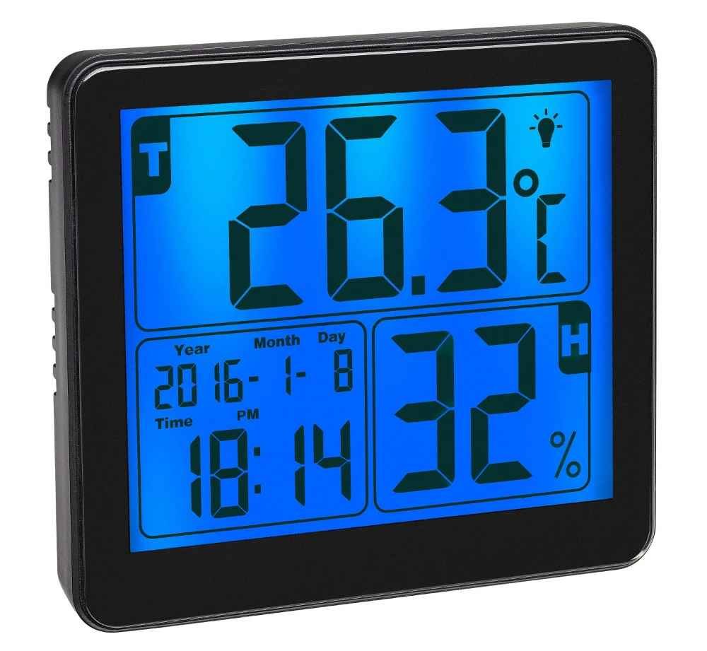 Zwei Drittel seiner Lebenszeit verbringt der Mensch mindestens in Innenräumen. Ob wir uns dort wohl und behaglich fühlen, hängt in hohem Maße von der Qualität der Raumluft ab. Das digitale Thermo-Hygrometer ist ein ideales Messinstrument zur Überwachung des Raumklimas. Raumtemperatur und Luftfeuchtigkeit können Sie einfach im Blick behalten und durch gezieltes Heizen und Lüften regulieren. So schaffen Sie sich ein behagliches und gesundes Wohnklima und sparen sogar Heizkosten. Zusätzlich bietet Ihnen das Thermo-Hygrometer die Anzeige der Höchst- und Tiefstwerte, der Uhrzeit oder des Datums, sowie einen Weckalarm der Sie immer zur richtigen Zeit aus dem Schlummer holt.