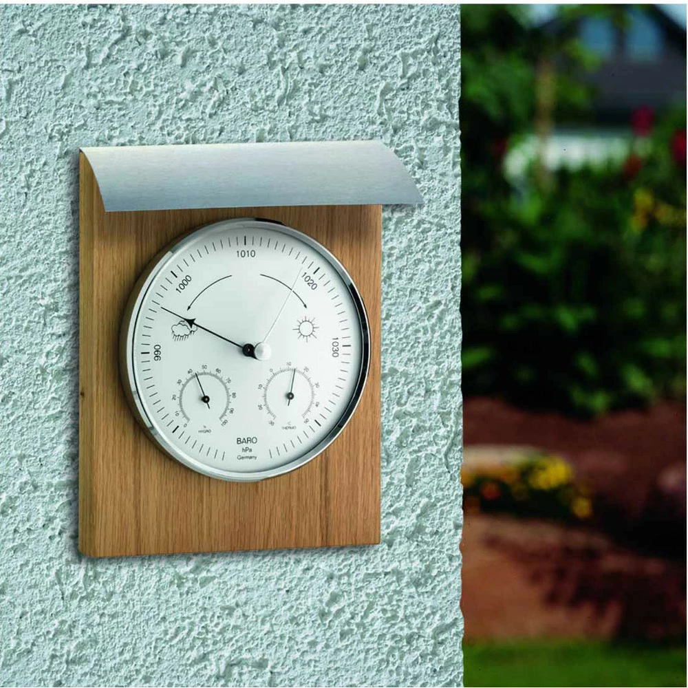 Durch das klare und moderne Design fügt sich diese Wetterstation aus geölter Eiche und Edelstahl harmonisch in jede Umgebung ein. Sie kann sowohl im Wohnraum als auch auf dem Balkon oder der Terrasse genutzt werden. Die Imprägnierung mit Öl gibt dem Holz die nötige Wetterresistenz für den Außenbereich und die natürliche Holzstruktur bleibt erhalten. Das Station besteht aus Barometer, Thermometer und Hygrometer. Das Barometer misst den Luftdruck und ermöglicht Ihnen eine lokale Wettervorhersage. Steigt der Luftdruck, bessert sich das Wetter. Bei sinkendem Luftdruck müssen Sie mit schlechterem Wetter rechnen. Das Thermometer zeigt die Temperatur und das Hygrometer die Luftfeuchtigkeit an.