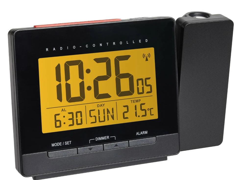 Mit diesem Funk-Projektionswecker haben Sie die aktuelle Uhrzeit klar vor Augen, denn sie wird als Digitalanzeige in roten Ziffern an Ihre Wand oder Decke projiziert. Gleichzeitig erscheint auch die Raumtemperatur und Sie können überprüfen, ob der Wert im idealen Bereich für einen erholsamen Schlaf liegt (16°C bis 18°C). Ist die Alarmfunktion eingeschaltet, erscheint zusätzlich das Wecksymbol auf der projizierten Anzeige und Sie haben die Gewissheit, dass ihr Wecker zur eingestellten Zeit klingelt. Die Projektion und die Displaybeleuchtung lassen sich in zwei Helligkeitsstufen einstellen oder ganz ausschalten.