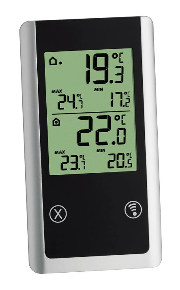 Dieser elegante Funkthermometer zeigt die Innen- und Außentemperatur an. Die Daten der Außentemperatur werden über Funk 433 MHz übertragen. Es speichert die Minimal- und Maximal Werte der Temperaturen und zeigt sie übersichtlich an.
