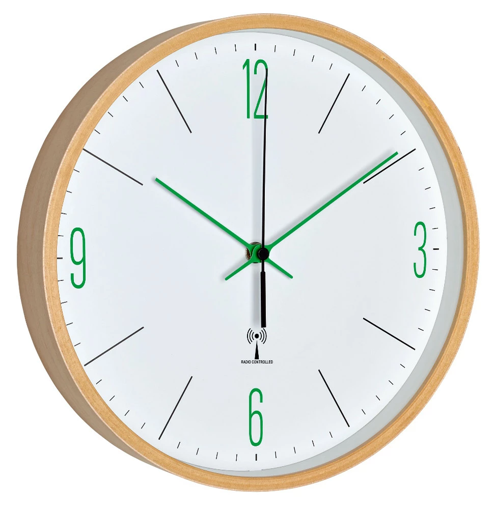 Diese edle Wanduhr hat ein Rahmen aus Buchenholz. Das weiße Ziffernblatt und die farbigen Zeiger werden durch eine Scheibe aus Echtglas geschützt. Die Funkuhr stellt sich von selbst und zeigt die Zeit fast atomgenau an. Sommer-Winterzeit werden automatisch eingestellt. Die Funkuhr verfügt über einen Sekundenzeiger.