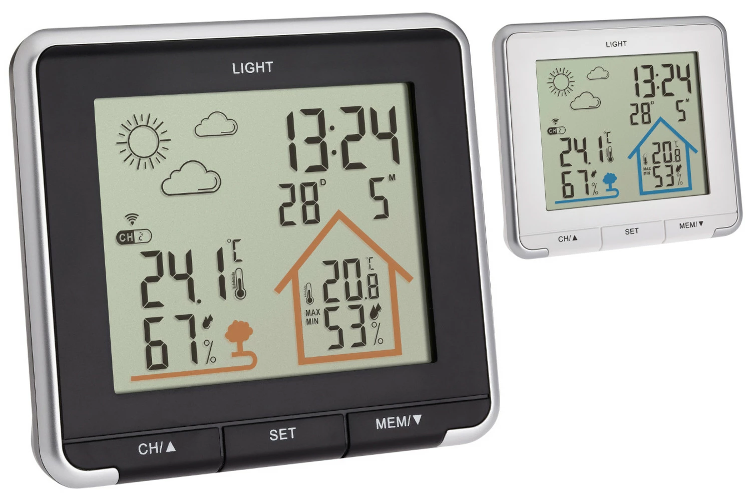 Die Life Funkwetterstation versorgt Sie mit nützlichen Informationen rund um Haus und Garten. Auf dem übersichtlichen Display findet man sich sofort zurecht. Unter der Uhrzeit mit Datum erscheint das Raumklima im farbigen Häuschen. Außentemperatur und Luftfeuchtigkeit werden mit einem stilisierten Baum gekennzeichnet und Symbole zeigen die aktuellen Wetterbedingungen an.