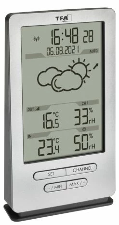 Mit einem Blick auf das Display der Funk-Wetterstation Xena sind Sie immer informiert. Außentemperatur und Luftfeuchtigkeit vor Ort werden von dem mitgelieferten Funksender direkt auf das Display übermittelt. Sonne, Wolken, Regentropfen oder Schneefall – ein elektronisches Barometer misst den Luftdruck; auf Basis der Veränderungen gibt das Wettersymbol eine Wettertrend für das kommende Wetter. Zur Kontrolle des Raumklimas werden Temperatur und Luftfeuchtigkeit angezeigt. Durch gezieltes Heizen und Lüften schaffen Sie sich ein angenehmes und gesundes Wohnklima und sparen sogar Heizkosten. Die aktuelle Uhrzeit und das Datum werden über das DCF 77 Funksignal empfangen. Zusätzlich wird auf dem Display die Komfortstufe mit einem Smiley angezeigt