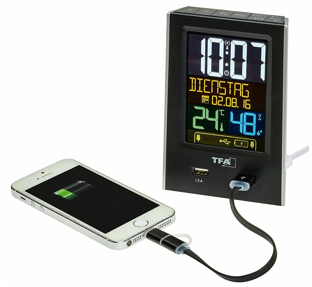 Mit dem Funkwecker CHARGE-IT haben Sie neben der aktuellen Uhrzeit und dem ausgeschriebenem Datum auch das Raumklima immer im Blick. Durch das farbige Display mit Hintergrundbeleuchtung lässt sich die Anzeige auch im Dunkeln gut ablesen. Besondere Highlights sind die eingebaute Ladefunktion für Geräte mit USB Anschluss und die Kurzschlaf-Funktion.