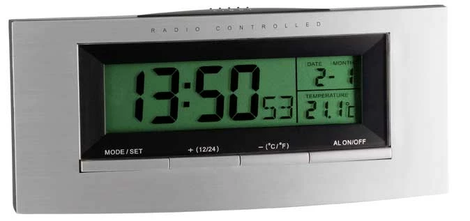 Der Funkwecker zeigt über das DCF-77 Funksignal aus Frankfurt fast atomgenau die Uhrzeit an. Er verfügt über große, gut zu erkennende Zahlen und hat eine Hintergrundbeleuchtung auf Knopfdruck. Zudem zeigt der Funkwecker das Datum und die Raumtemperatur an.