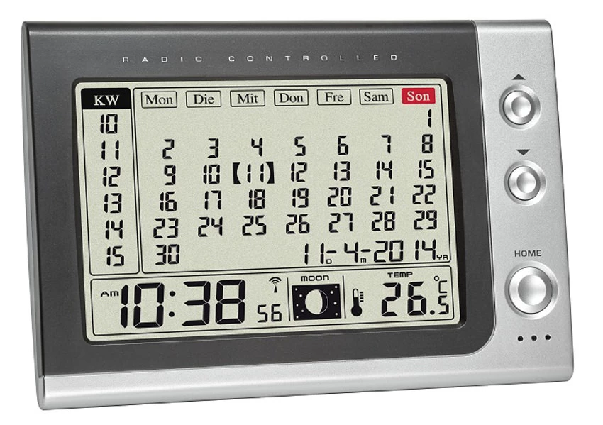 Dieser TFA-Funkwecker mit Kalenderfunktion macht sich gut im Büro auf dem Schreibtisch, aber auch zuhause im Wohn- oder Schlafzimmer. Das große Display zeigt Ihnen eine Übersicht des gesamten Monats an, inklusive Kalenderwoche und Wochentag sowie der Mondphase. In dem virtuellen Kalender können Sie nach Belieben hin und her blättern und sich an Geburtstage oder andere Termine erinnern lassen. Das integrierte Thermometer misst die Raumtemperatur und sorgt für ein gutes Klima am Aufstellort. Mit der sekundengenauen Funkuhr ist man beim Wecken auf der sicheren Seite und die Schlummerfunktion ermöglicht ein sanftes Aufwachen. Die Hintergrundbeleuchtung funktioniert per Knopfdruck.