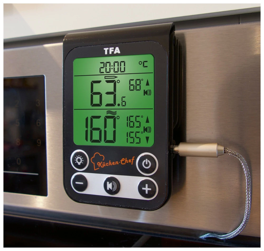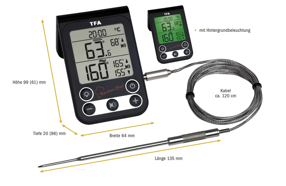 Stellen oder hängen Sie das Gerät in Ofennähe auf. Das Gerät ist einfach zu bedienen und durch das hell beleuchtbare Display immer sehr gut ablesbar. Auch zum Garen bei Niedrigtemperaturen ist der Küchen-Chef hervorragend geeignet.