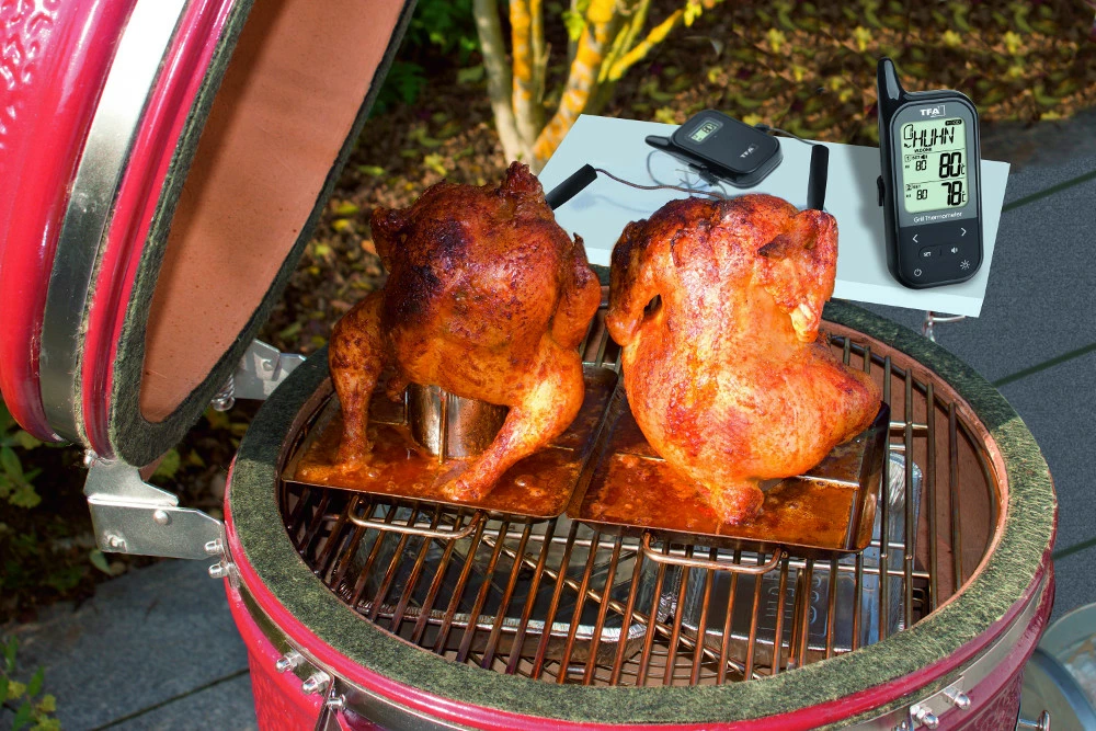 Und dazu müssen Sie sich nicht einmal in der Küche aufhalten – per Funk werden die gemessenen Werte vom Sender an das Hauptgerät übertragen. So können Sie die Zeit sinnvoll nutzen und schon mal Ihre Gäste empfangen, solange der Braten noch im Ofen schmaucht oder auf dem Grill liegt. Per Signalton werden Sie auf das Erreichen der gewünschten Temperaturen aufmerksam gemacht. Das Funk-Grill-Bratenthermometer Küchen-Chef Twin hat gleich zwei Edelstahlfühler. Damit kann wahlweise die Garraumtemperatur vom Grill oder Backofen mit Temperaturober- und Untergrenze oder die Kerntemperatur von maximal zwei Brat- oder Grillstücken überwacht werden.