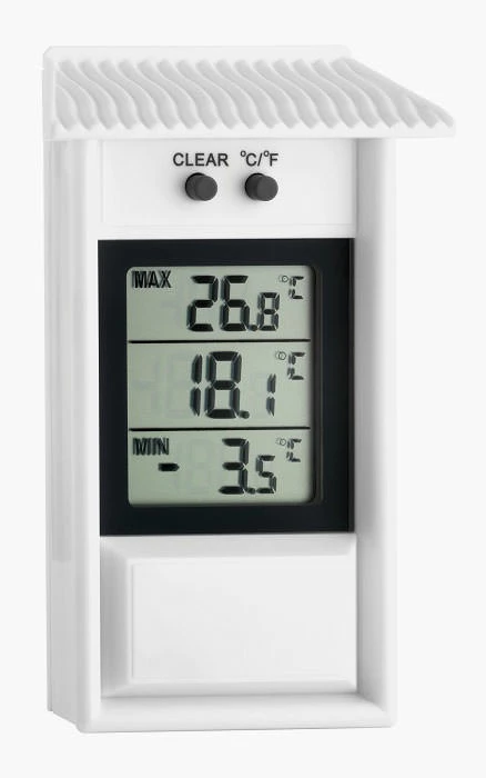 Digitales Thermometer für Innen und Außen TFA 30.1053 Dieses elektronische Messgerät zeigt Ihnen die aktuelle Temperatur, sowie die Höchst- und Tiefstwerte seit der letzten Rückstellung. Es ist sehr genau mit einer Auflösung von 0,1 Grad Celsius Es kann zur Temperaturkontrolle von Wohnräumen, Gewächshaus, Wintergarten, Tiefkühltruhe aber auch im Freien problemlos verwendet werden. Das Gerät ist spritzwassergeschützt und frostsicher