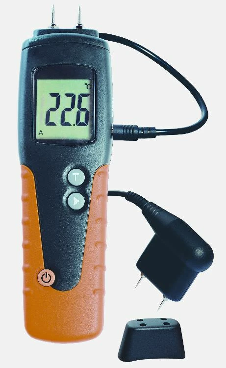 Das tragbare, hochgenaue Profi-Messgerät wird als Set in einer praktischen Nylon-Aufbewahrungstasche geliefert. Es eignet sich ideal für Feuchte-Messungen von Holz, Putz, Mörtel usw.. Sie pressen die beiden sehr spitzigen Nadel-Elektroden in das zu messende Material und das Messergebnis wird sofort auf der LCD-Anzeige dargestellt. Das Messprinzip ist der elektrische Widerstand im Material. Die Methode erlaubt absolut genaue Ergebnisse, bei Holz +- 1 %, bei anderen Materialien +-0,05 %. Durch den beigefügten Temperaturfühler erfolgt automatisch eine Wertekorrektur, da Holz je nach Temperatur einen höheren oder niedrigeren Messwert erzeugt. Genauer geht es nicht. Für Holzmessungen sind 8 Kennlinien für 150 verschiedene Holzsorten hinterlegt
