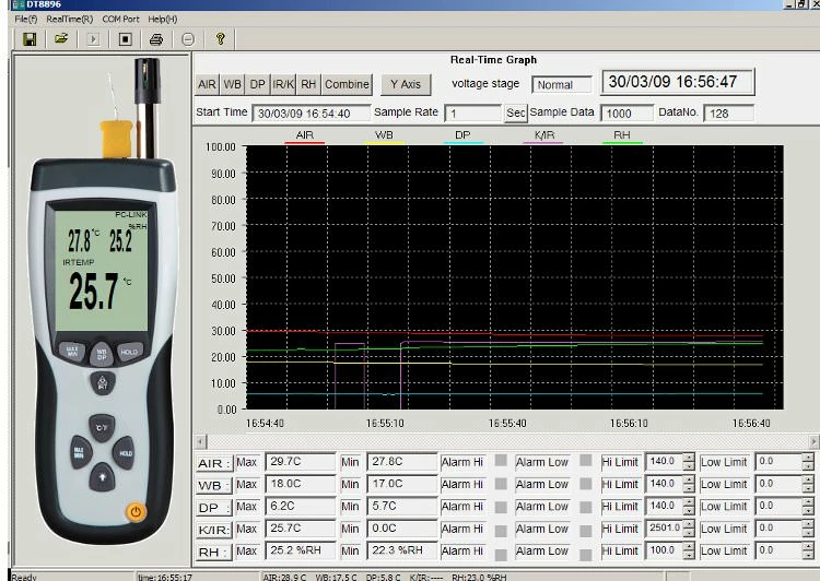 Das Psychrometer verfügt über einen sehr genauen Sensor zur Messung der Raum-Luftfeuchtigkeit und Temperatur. Gleichzeitig kann mit einem zusätzlich eingebauten Infrarot-Thermometer die Temperatur von Oberflächen gemessen werden. Ein Anschluss für Thermo-Element-Fühler Typ K und eine mitgelieferte Temperatursonde ergänzen das Mehrfach-Instrument. Das Gerät hat weiterhin eine USB-PC-Schnittstelle für Dokumentation und Speicherung, Laserpointer und LCD-Hintergrundbeleuchtung