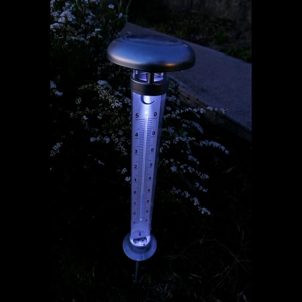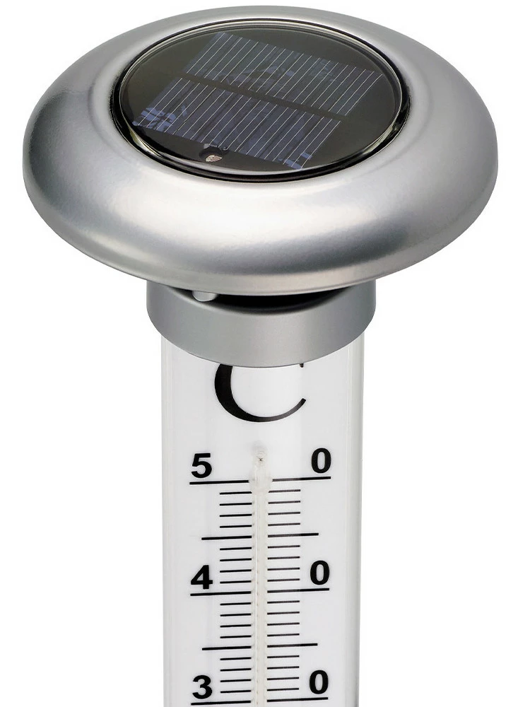 Der Gartenthermometer Solino verfügt über Solarzellen, die sich tagsüber aufladen und dann bei Dunkelheit automatisch die große Skala beleuchten. So kann die Temperatur auch aus weiterer Entfernung und bei Nacht gut abgelesen werden. Es wird einfach mit dem Erdspieß in den Boden gesteckt.