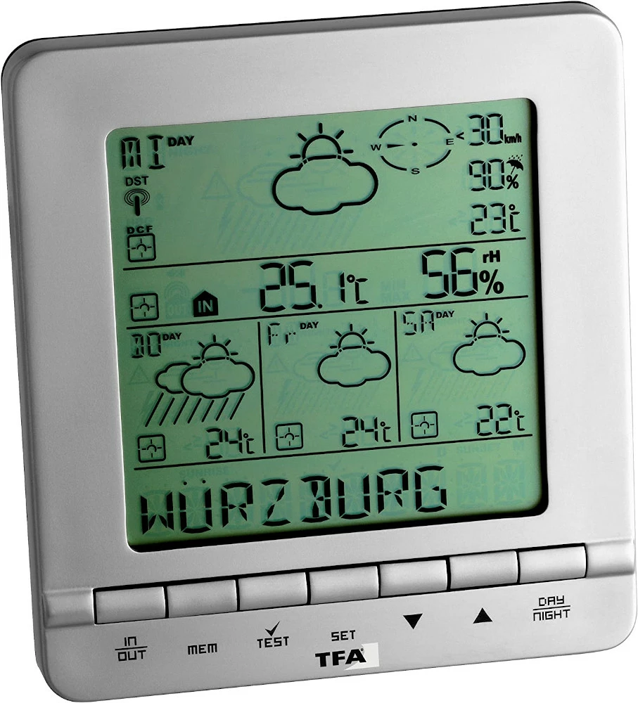 Das MeteoTime Star Wetter-Info-Center bietet Ihnen eine professionelle Wettervorhersage für den aktuellen Tag und die nächsten drei Tage. Die von Meteorologen erstellten Wettervorhersagen werden über Zeitzeichen-Sender DCF77 in Deutschland ausgestrahlt und sind in fast ganz Europa empfangbar.Insgesamt ist der Empfangsbereich in 90 meteorologische Regionen (60 Regionen mit 4-Tages-Vorhersage, 30 Regionen mit 2-Tages-Vorhersage) aufgeteilt. Die gewünschte Region wird einfach ausgewählt und die jeweils aktuelle Wettervorhersage wird auf dem Display dargestellt. Zusätzlich erhalten Sie nützliche Wetterinformationen wie Höchst- und Tiefsttemperaturen, besondere Wettersituationen als Text in 7 Sprachen oder die Wahrscheinlichkeit für Regen, Schnee und Hagel. Somit hat man jederzeit einen schnellen Überblick über den Wetterverlauf der nächsten Tage. Die Aktualisierung erfolgt mehrmals täglich. Außentemperatur und Luftfeuchtigkeit vor Ort werden über einen eigenen Funksender ermittelt, das Raumklima messen interne Sensoren. Uhrzeit und Datum werden ebenfalls über Funk aktualisiert.