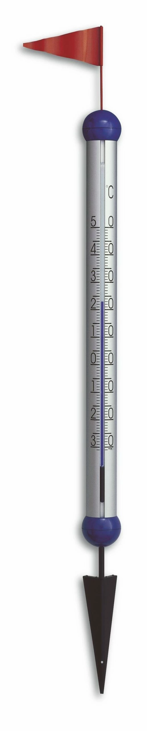 Dieses große Gartenthermometer mit der originellen roten Metallfahne ist ein echtes Design-Highlight für jeden Garten. Es wird einfach mit dem Erdspieß in den Boden gesteckt. Die Temperatur kann auch aus größerer Entfernung gut abgelesen werden. Eloxiertes Aluminium, lackiertes Metall und hochwertige Kunststoffteile sorgen für Winter- und Wetterfestigkeit. Das Thermometer ist komplett in Deutschland hergestellt. Eine 2-Punkt-Justierung macht es besonders genau. Gefüllt werden die Kapillaren mit einem speziell eingefärbten Alkohol. Das gefährliche Quecksilber wird dafür schon lange nicht mehr genutzt.
