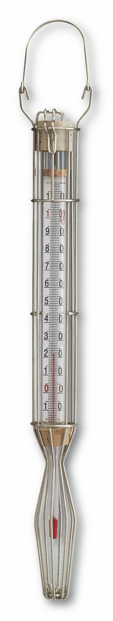 Ob zum Einkochen von Obst und Gemüse, für das Abfüllen von Säften oder zum Bierbrauen – dieses nützliche Thermometer sollte in keinem Haushalt fehlen. Naturkork am oberen und unteren Ende sorgt dafür, dass das Thermometer in Flüssigkeiten aufrecht schwimmt. Der hochwertige Glas-Einsatz lässt sich besonders gut abwaschen – für noch mehr Hygiene in Ihrer Küche. Ein robustes Drahtgehäuse schützt den Einsatz vor dem Zerbrechen. Das Thermometer ist komplett in Deutschland gefertigt. Gefüllt werden die Kapillaren mit einem speziell eingefärbten Alkohol. Das gefährliche Quecksilber wird dafür schon lange nicht mehr genutzt.