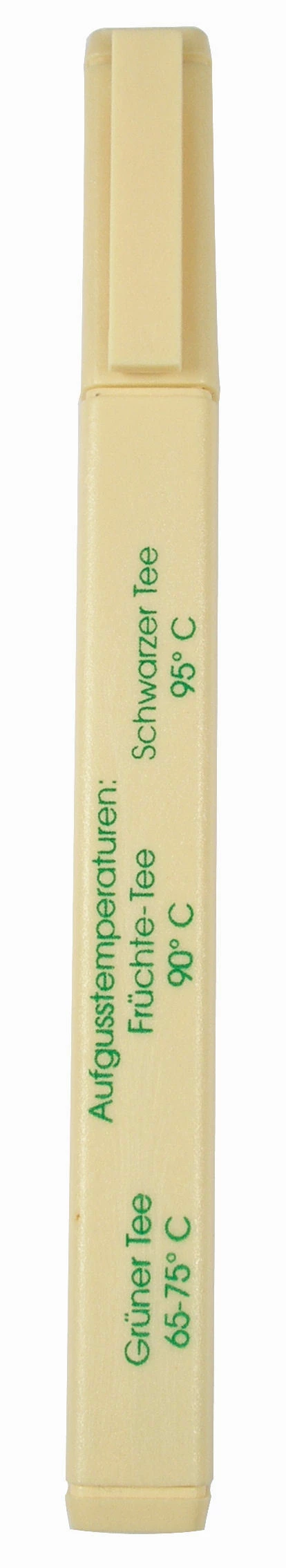 Die Teegenießer unter Ihnen wissen: Tee gelingt nur dann perfekt, wenn die Temperatur beim Aufbrühen stimmt. Schwarzer Tee braucht beispielsweise kochendes Wasser, während das Wasser beim Grünen Tee nicht zu heiß sein darf. Mit diesem Teethermometer haben Sie die Aufgusstemperatur immer im Blick. Auf der Hülle sind die idealen Temperaturen je nach Teesorte aufgedruckt – für einen vollkommenen Teegenuss. Gefüllt werden die Kapillaren mit einer speziell eingefärbten Thermometerflüssigkeit. Quecksilber wird dafür schon lange nicht mehr genutzt.
