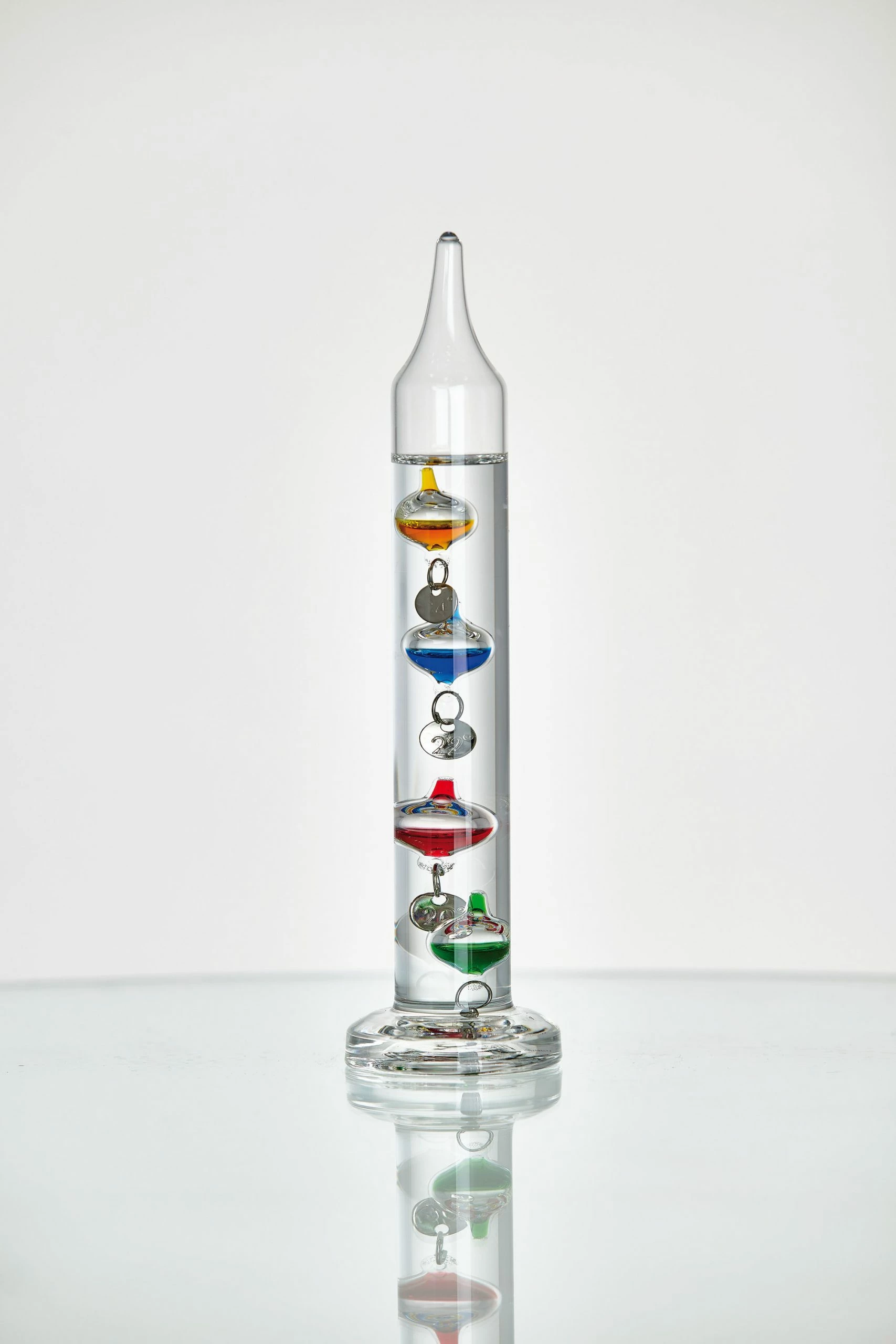 Flüssigkeitsthermometer gefertigt nach der Idee von Galileo Galilei (1564-1642). Galileo entdeckte, dass Flüssigkeiten je nach Temperatur ihre Dichte verändern. Steigt die Temperatur, so verringert sich die Dichte der Flüssigkeit im Thermometer. Die vergleichsweise schwereren Kugeln verlieren an Auftrieb und sinken. Nimmt auf der anderen Seite die Raumtemperatur wieder ab, so gewinnen die leichteren Kugeln an Auftrieb und steigen nach und nach auf. Der Gewichtsunterschied der 4 Glaskugeln ist (auf ein hundertstel Gramm) genau so bemessen, dass immer die unterste der oben schwimmenden Kugeln im Bereich von 18°C bis 24°C die aktuelle Temperatur anzeigt.