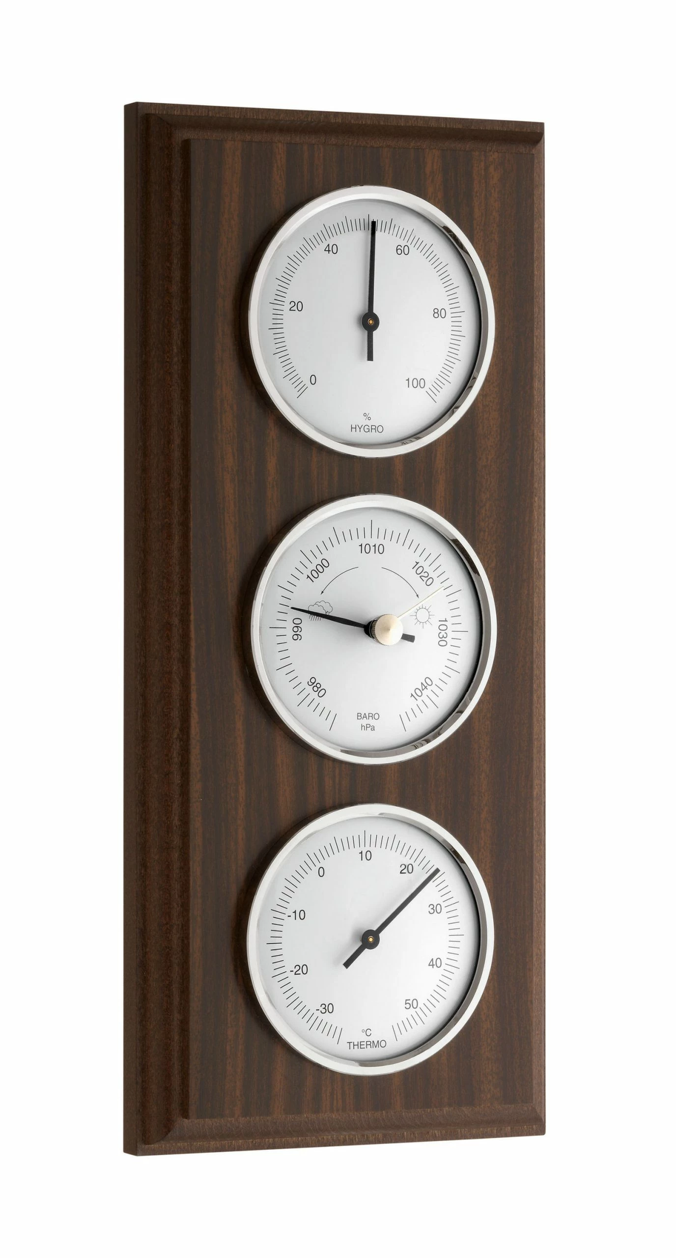 Schätzen Sie einen klassischen und zeitlos-exklusiven Wohnstil? Dann passt diese exklusive Wetterstation aus Nussbaumholz mit Zierkanten gut zu Ihrer Einrichtung. Das nützliche Instrument besteht aus einem Barometer, Thermometer und Hygrometer. Das Barometer misst den Luftdruck und ermöglicht Ihnen eine lokale Wettervorhersage. Steigt der Luftdruck, bessert sich das Wetter. Bei sinkendem Luftdruck müssen Sie mit schlechterem Wetter rechnen. Durch die Kontrolle von Innentemperatur und Luftfeuchtigkeit schaffen Sie sich ein behagliches und gesundes Raumklima und sparen Heizkosten. Die Station wird komplett in Deutschland gefertigt.
