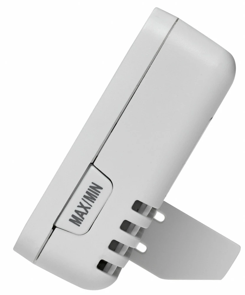 Zwei kleinen Magneten auf der Rückseite halten das Thermometer an Metallflächen fest. Möchten Sie das Gerät aufstellen, dann kommt der ausklappbare Ständer zum Einsatz.