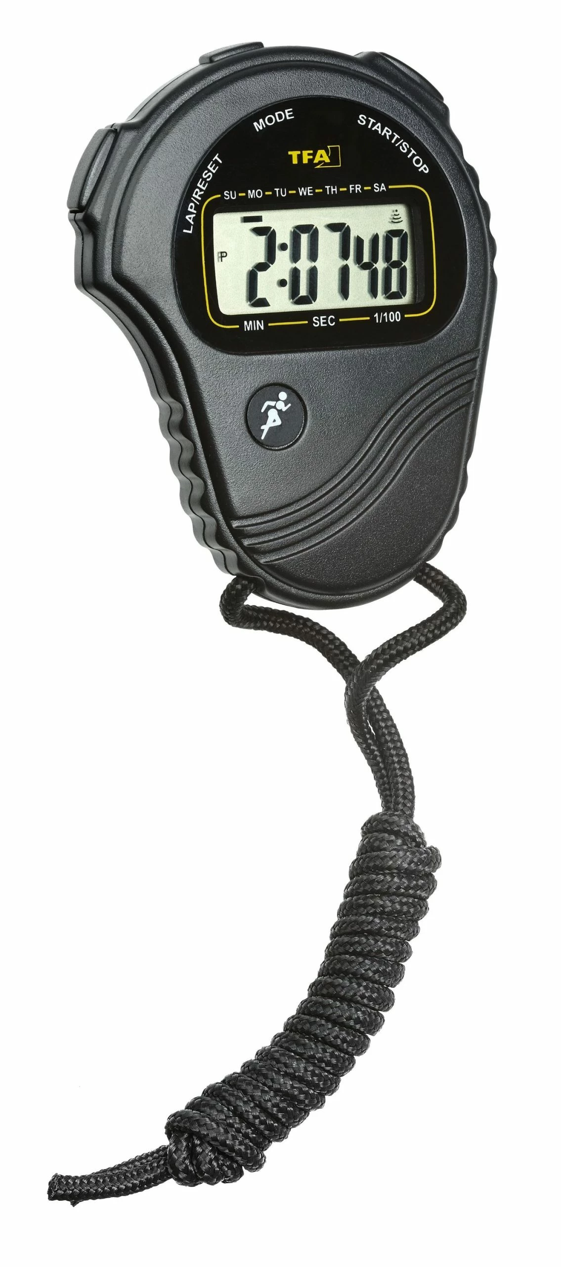 Diese kleine und kompakte Stoppuhr ist der ideale Begleiter in Freizeit und Beruf. Ob im Wettkampf, Training oder im Labor, sie misst die Zeit zuverlässig auf 1/100 Sekunde genau und kann Zwischenzeiten anzeigen. Darüber hinaus verfügt sie über einige nützliche Zusatzfunktionen, wie ein Stundensignal oder einen Alarm mit Snooze-Funktion. Ein praktisches Umhängeband ist dabei.