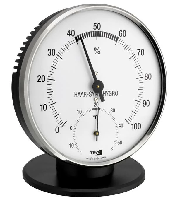 Ob wir uns zuhause wohl und behaglich fühlen, hängt in hohem Maße von der Qualität der Raumluft ab. Das Thermo-Hygrometer mit verchromtem Messingring ist ein ideales Instrument zur Überwachung des Raumklimas. Temperatur und Luftfeuchtigkeit können Sie einfach im Blick behalten und durch gezieltes Heizen und Lüften regulieren, wenn die Werte außerhalb der gekennzeichneten Komfortzonen liegen. So schaffen Sie sich ein angenehmes und gesundes Wohnklima und sparen sogar Heizkosten. Einfach aufhängen oder mit dem Standfuß aufstellen. Das Gerät wird komplett in Deutschland gefertigt.