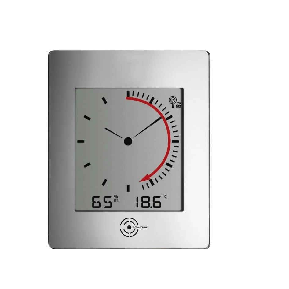 Modernes Design und eine innovative Anzeige vereinen sich in der Funk-Wanduhr “DIALOG REFLEX” von TFA Dostmann. Im Fokus steht ein analoges Zifferblatt, auf dem die aktuelle Uhrzeit mit Stunden- und Minutenzeiger abgelesen werden kann. Als besonderes Highlight werden die Sekunden als permanent umlaufende Anzeige dargestellt. Über eine Sensortaste wechselt die Digitalanzeige von Datum und Wochentag auf Innentemperatur und Luftfeuchtigkeit, Kalenderwoche oder die digitale Uhrzeit. Der elegante Spiegelrahmen rundet den hochwertigen Charakter dieser Funk-Wanduhr ab. Die TFA Funk-Wanduhr “DIALOG REFLEX” empfängt die Uhrzeit über das DCF 77 Signal. Damit haben Sie stets die aktuelle Uhrzeit und das Datum auf die Sekunde genau im Blick und es entfällt die Umstellung von Sommer- auf Winterzeit.