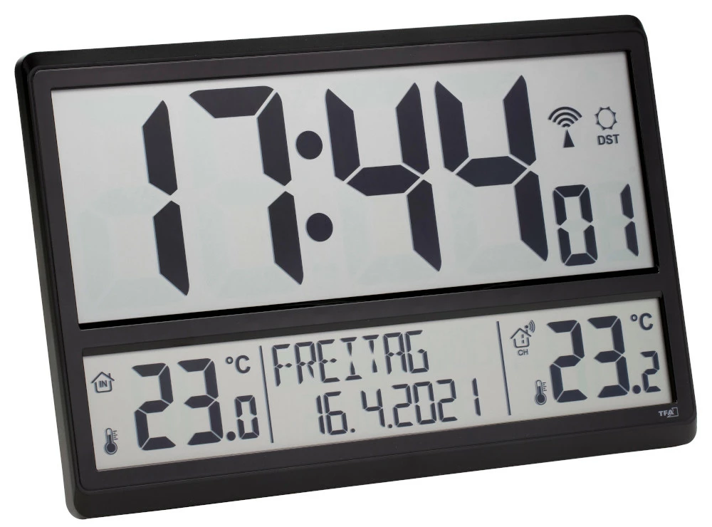 Diese XL-Funkuhr von TFA überzeugt durch das ausgesprochen übersichtliche Display. Die großformatige Anzeige lässt sich auch von weitem sehr gut ablesen und eignet sich besonders für den Eingangs- oder Empfangsbereich, das Wartezimmer und das Büro. Neben dem voll ausgeschriebenen Wochentag und Datum wird auch noch die Innentemperatur angezeigt. So können Sie für angenehme Temperaturen in Ihren Wohn- und Arbeitsräumen sorgen. Die Uhrzeit wird über das DCF77 Signal auf die Sekunde genau eingestellt und auch der Wechsel von Winter auf Sommerzeit erfolgt automatisch. Das schlichte und klare Design passt in jede Umgebung, gleichgültig, ob Sie die Funkuhr aufhängen oder hinstellen möchten.
