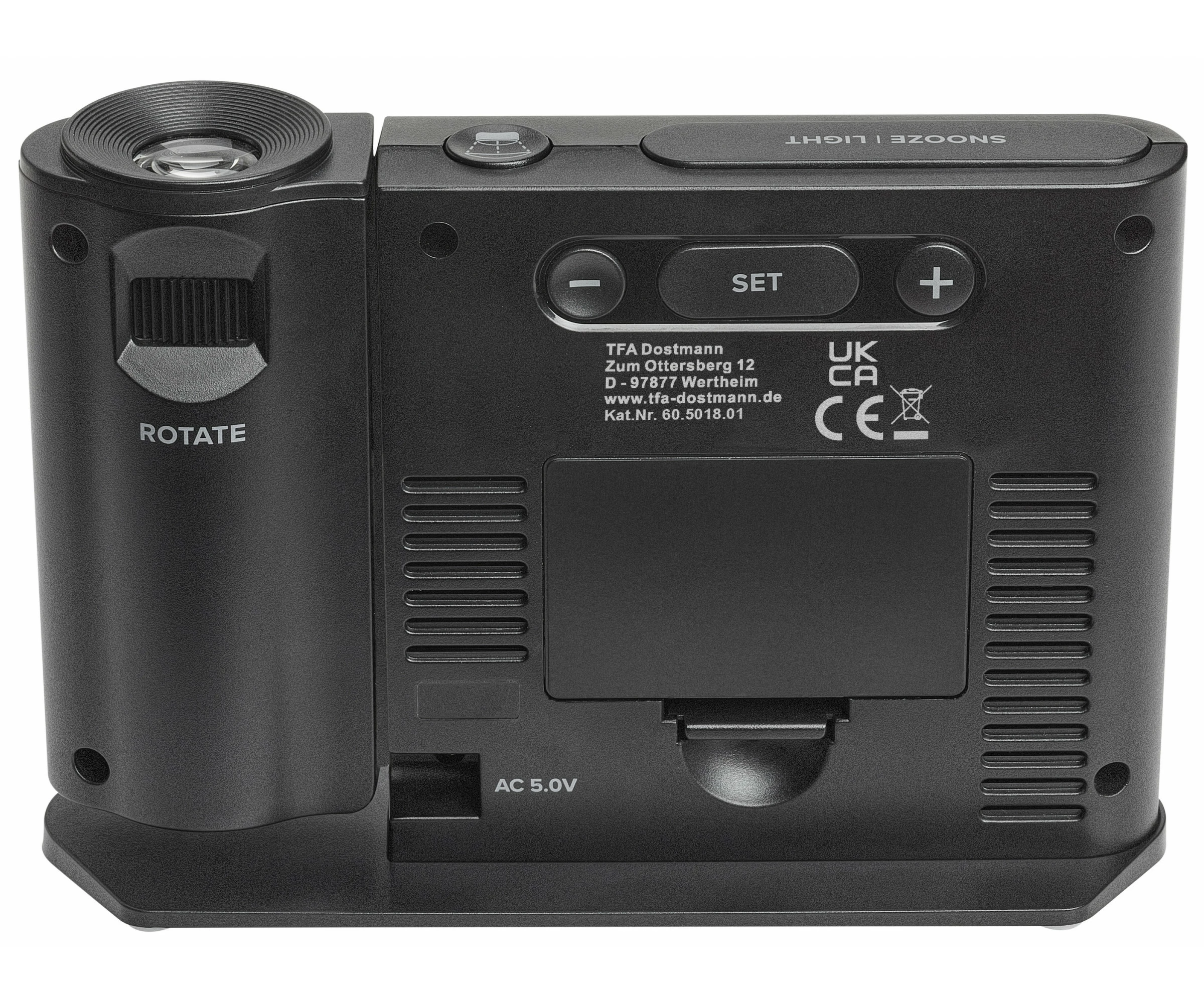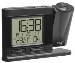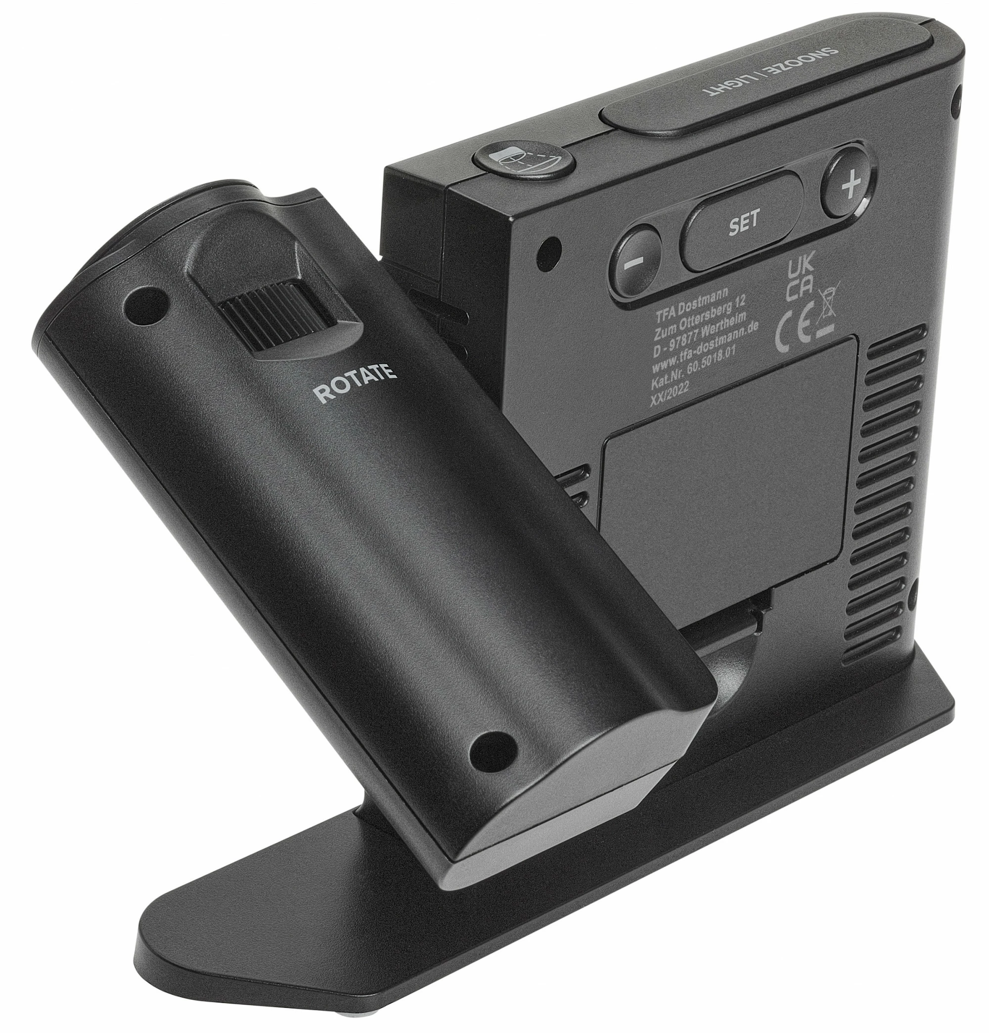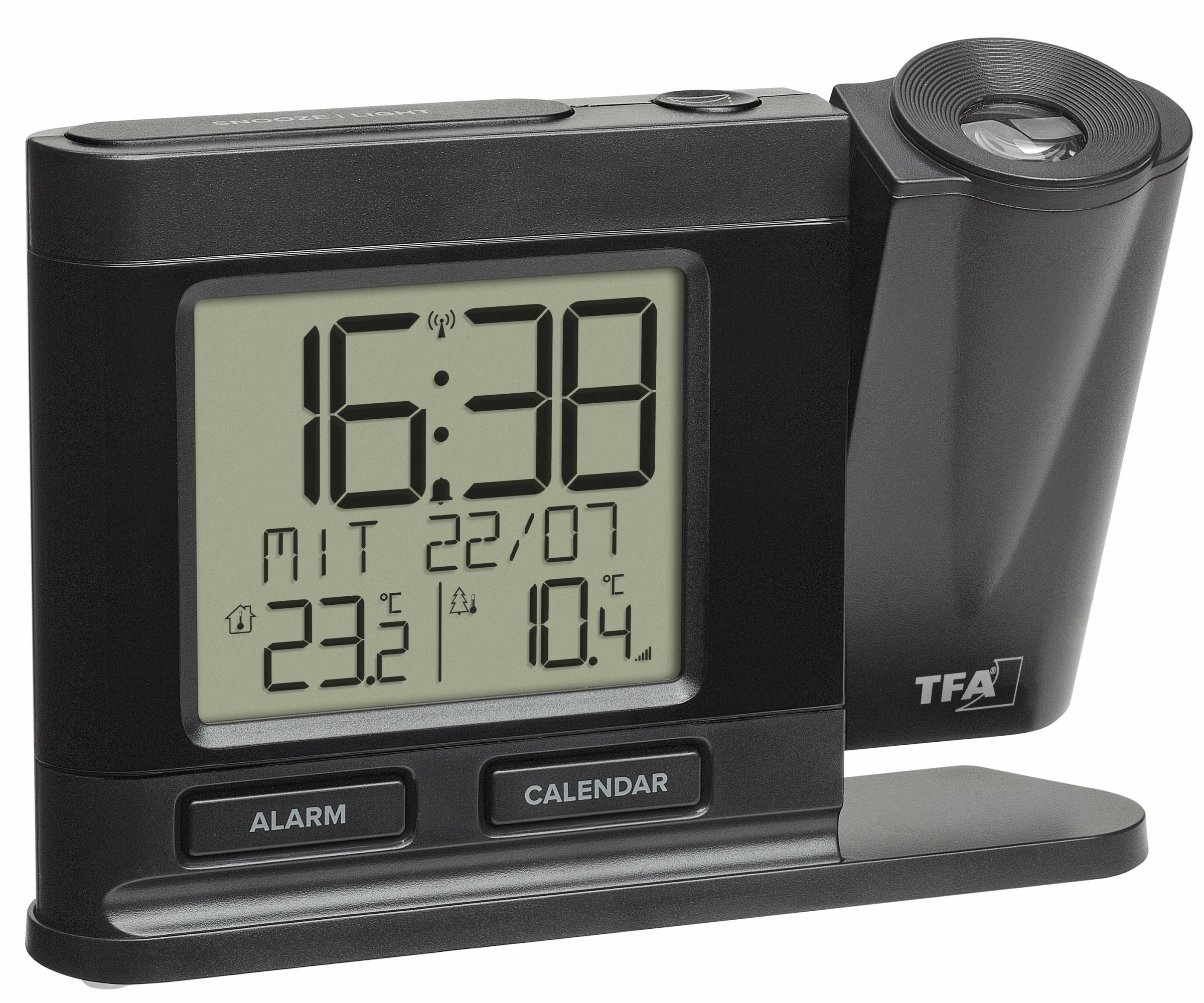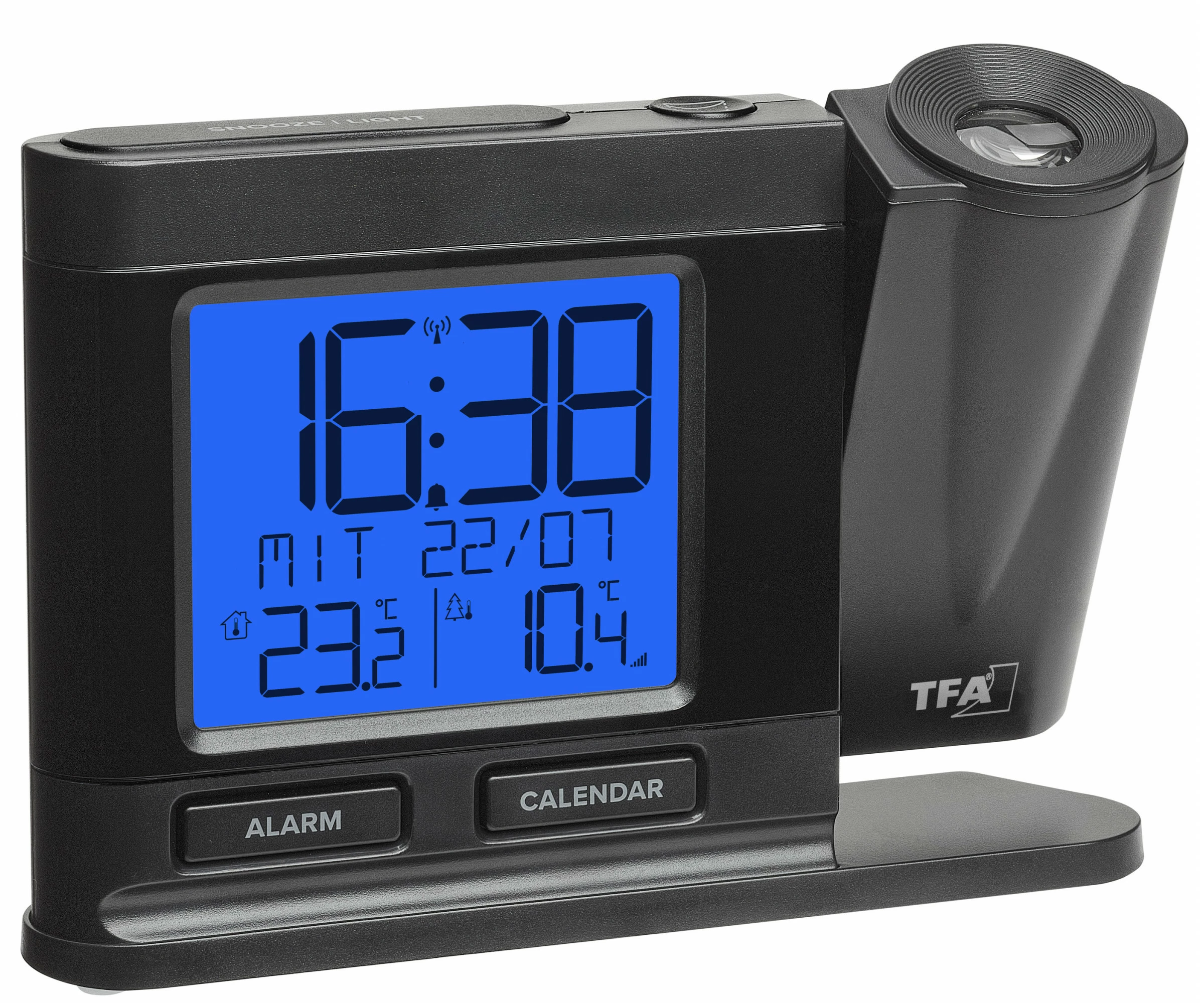 Ob Sie heute besser in eine lange oder in eine kurze Hose schlüpfen, diese Information liefert Ihnen der Funkwecker ebenfalls dank eines Funksenders, den Sie im Freien postieren. Auf Wunsch projiziert er die Innen- und Außentemperatur abwechselnd mit der Uhrzeit an die Wand. Die Anzeige lässt sich um 270° rotieren und in zwei verschiedene Helligkeiten einstellen.