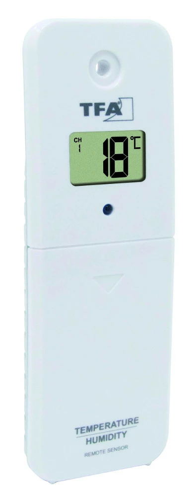 Dieser Außensensor überträgt über Frequenz 868 MHz Temperatur- und Hygrometerdatendaten zur Basisstation. Der Sender verfügt über eine eigene Anzeige über die gemessene Temperatur und die Luftfeuchtigkeit, er zeigt die Daten abwechselnd an.